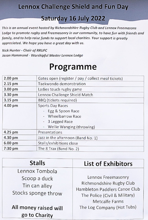 Lennox Lodge No 123 in conjunction with their local rugby club held a community fun day in Richmond on 16 July, with lodge members organising many events for those attending to participate in.